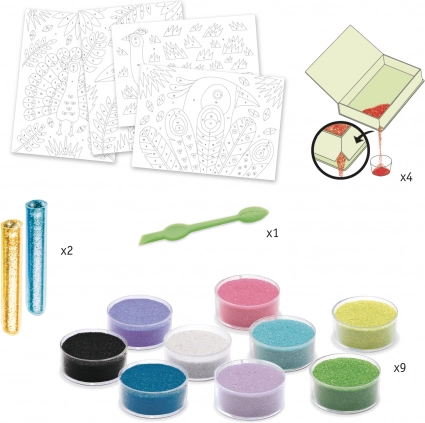 Vytvorte si nádherné obrázky z farebného piesku a trblietok so sadou Djeco! Obsahuje 4 obrázky, 9 kelímkov piesku, 2 tubičky flitrov a je vhodná pre deti od 6 rokov.