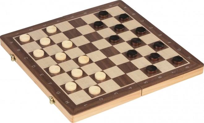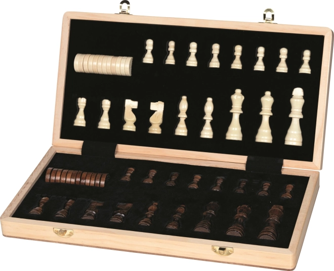 Praktická drevená šachovnica sa skladá do kompaktného kufríka so sponami, vo vnútri bezpečne uložíte všetky figúrky.