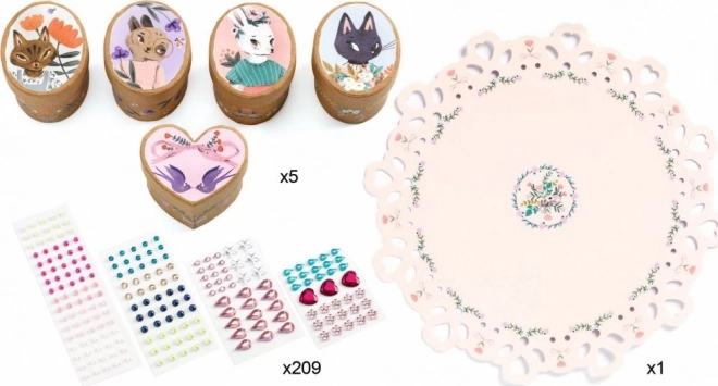 Kreatívna sada na výrobu rozkošných mini krabičiek, ktoré môžete ozdobiť podľa vlastných predstáv pomocou viac než 200 farebných samolepiacich drahokamov.