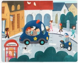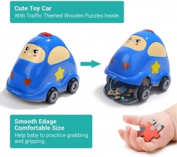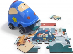 Šikovná kombinácia hračky a učenia: modré autíčko ukrýva drevené puzzle z 24 dielikov s motívom policajného auta. Dieliky majú na rube číslovanie pre jednoduchšie skladanie a autíčko ponúka úložný priestor aj kolieska na jazdu. Puzzle možno prepojiť s ďalšími vozidlami z mini série a vytvoriť panoramatické puzzle.