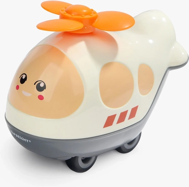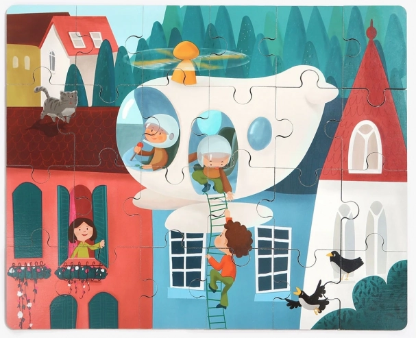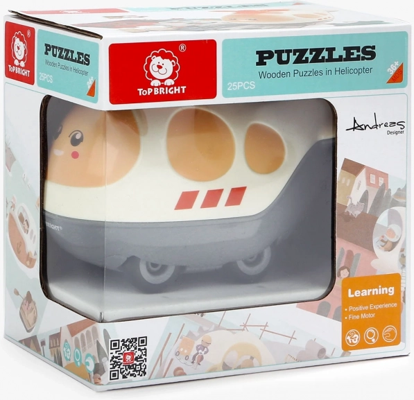 Plastový vrtuľník s kolieskami má zo spodnej strany otváracie veko, takže doň deti uložia celé puzzle alebo svoje malé poklady.