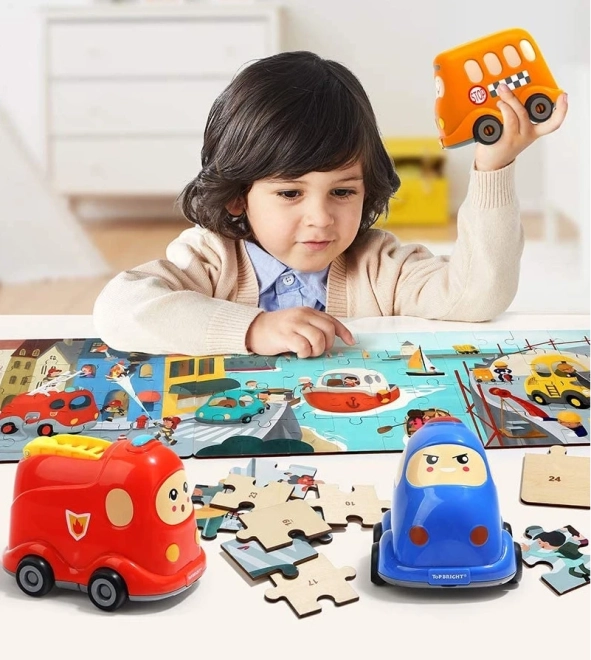 S ďalšími modelmi TOP BRIGHT (hasičské a policajné auto, školský autobus, buldozér, vrtuľník) poskladáte na podlahe plynulé panoramatické puzzle.
