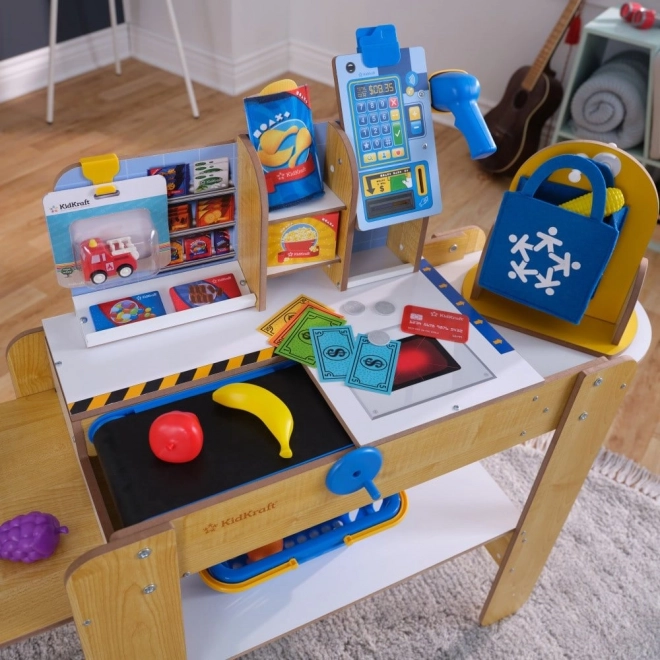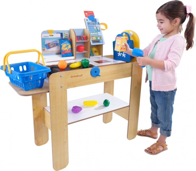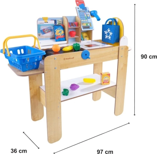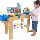Doprajte deťom realistickú hru na obchod s drevenou samoobslužnou pokladňou KIDKRAFT. Súčasťou je pohyblivý pokladničný pás, ručný skener so svetlami a zvukmi, 30 doplnkov vrátane potravín, košíka, tašky a karty. Hra rozvíja finančnú gramotnosť, predstavivosť aj sociálne zručnosti a vďaka pevnej drevenej konštrukcii vydrží roky zábavy.