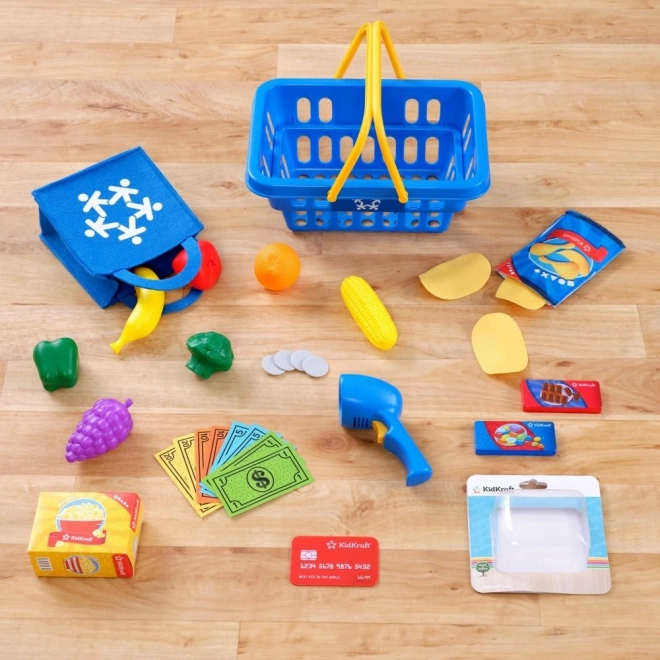 - 30 dielov: potraviny na hranie, košík, taška, kreditná karta, papierové bankovky a plastové mince
