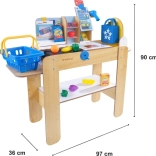 Sada obsahuje 30 kvalitných doplnkov (potraviny, košík, kreditná karta, taška, bankovky a mince) a otočný stojan na tašky ako v skutočnom obchode. Drevená konštrukcia KIDKRAFT zaisťuje stabilitu a dlhú životnosť, takže je ideálna na každodenné hranie.