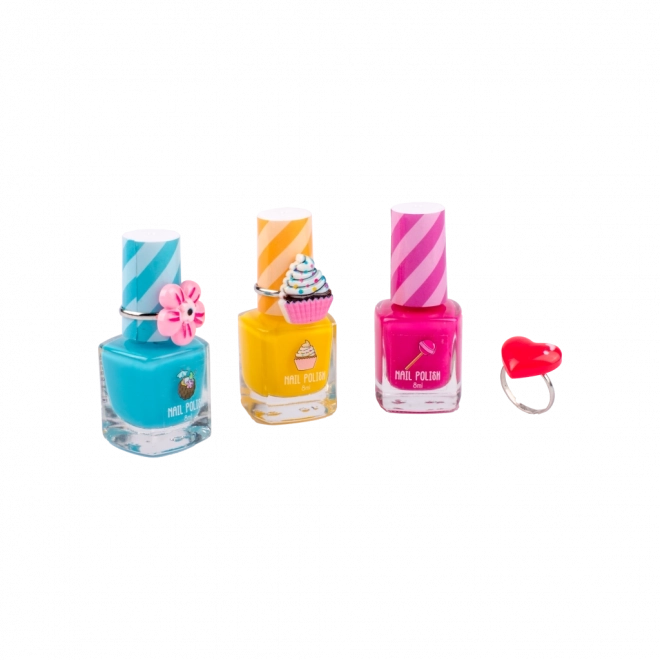 Každý lak dopĺňa tematický prstienok (kvet, srdce, cupcake), ktorý možno nosiť samostatne alebo zladiť s vybranou farbou.
