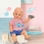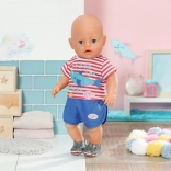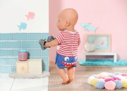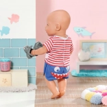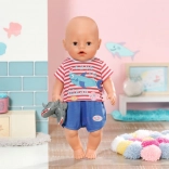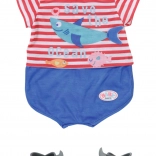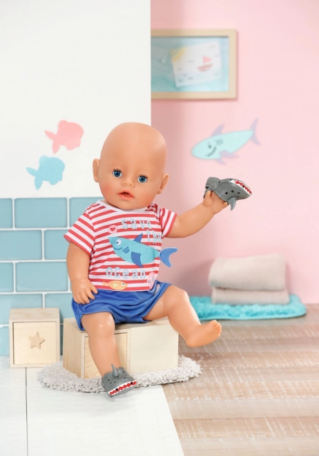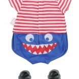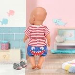 Doprajte svojej bábike štýlové zaspávanie s pyžamkom BABY born s oceánskym motívom. Pruhované červeno‑biele tričko so žralokom a modré spodné diely s úsmevom žraloka vyčarujú úsmev na tvári každému malému opatrovateľovi. Sivé topánočky v tvare žraloka outfit dokonale doplnia a podporia fantazijné hranie.