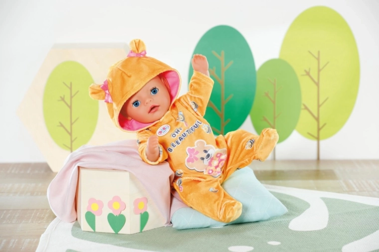 „Brum, brum!!!“ Čo to hučí v detskej izbičke? BABY born Little si obliekla medovo žltý overal a hrá sa na veľkého medveďa. Ale s roztomilými uškami na kapucni vyzerá skôr ako milučké medvieďa. Ušká sú navyše ozdobené ružovými mašličkami. Dupky sú ušité v štýle „easy fit“, takže prezliekanie hravo zvládnu aj najmenšie ručičky. Na obrázku, ktorý zdobí plyšový overal, práve medvedia slečna kŕmi včielky kvetinovou dobrotou. • Kvalitné oblečenie pre značkovú bábiku BABY born. • Pre radosť z nápaditej, rozmanitej a dlhotrvajúcej hry. • Strih „easy fit“ pre jednoduché prezliekanie. BABY born Little Overal medvedík pre bábiky veľkosti 36 cm. Vrátane ramienka.