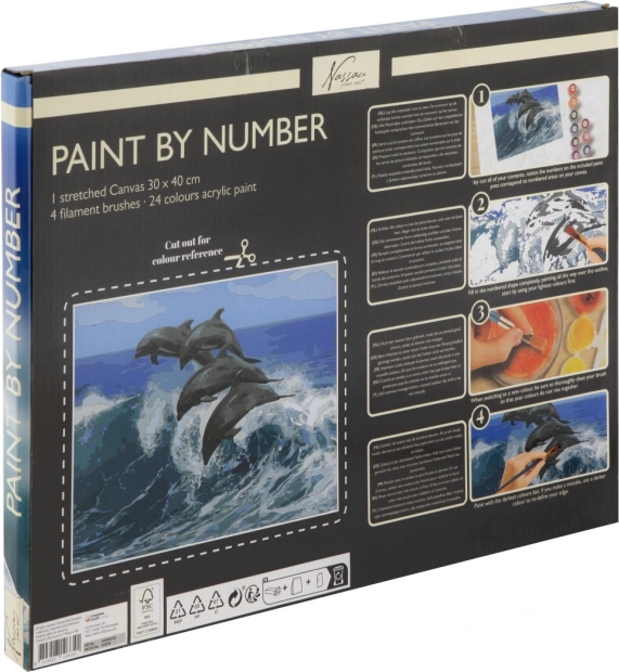 Táto kreatívna sada vám umožní jednoducho vytvoriť pôsobivý obraz s morským motívom. Stačí vyfarbovať očíslované plochy zodpovedajúcimi farbami a postupne vznikne realistická scéna s dynamickými delfínmi. Vďaka napnutému plátnu je výsledok ihneď pripravený na vystavenie.