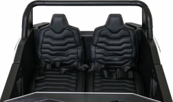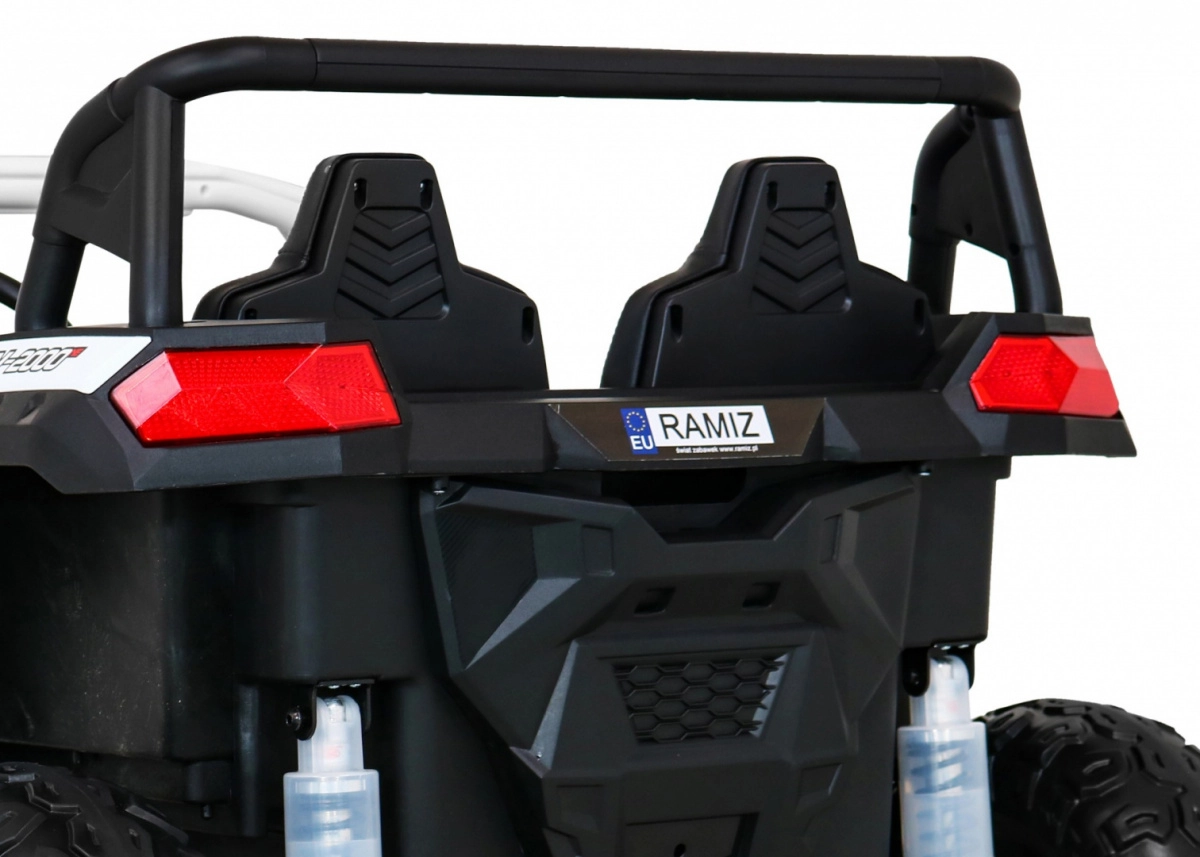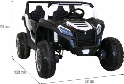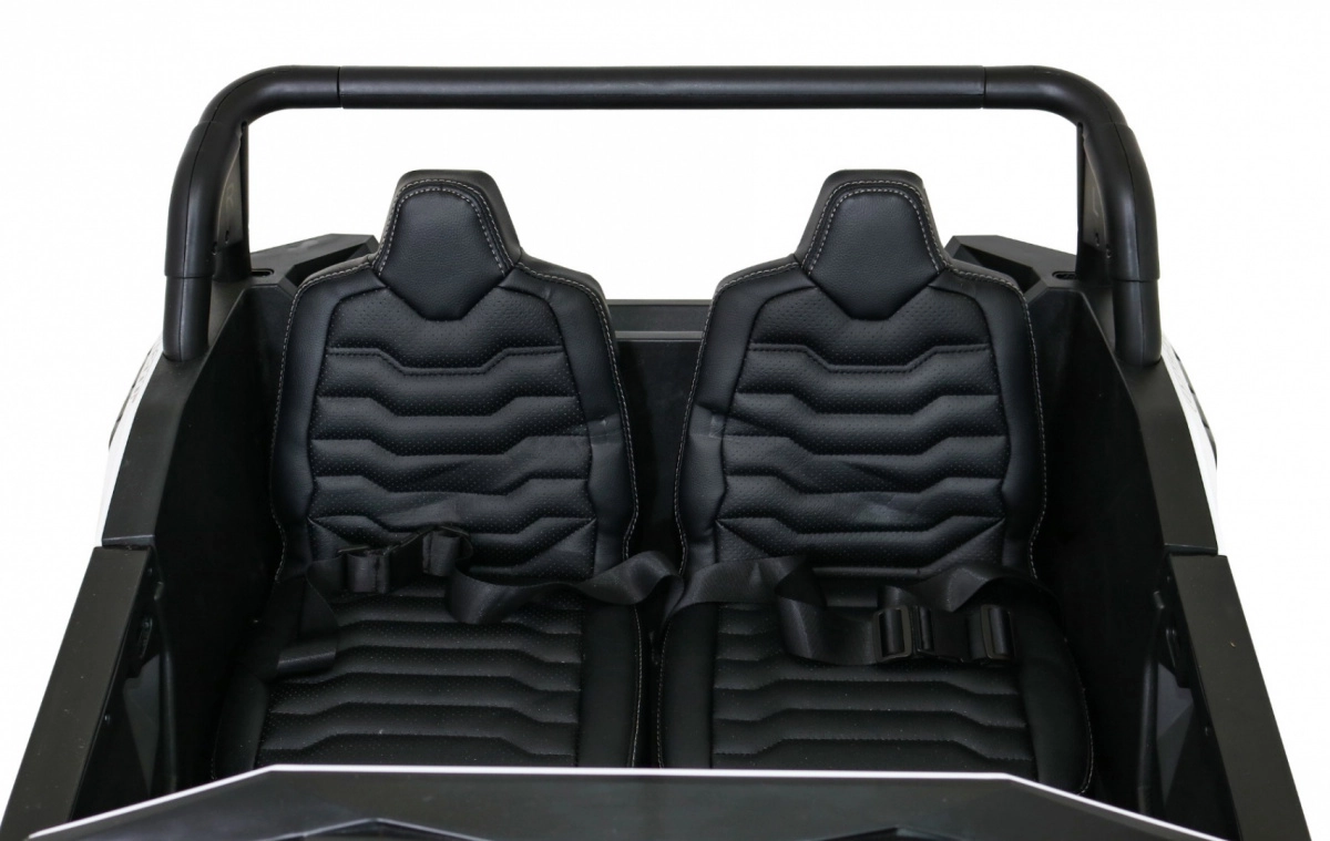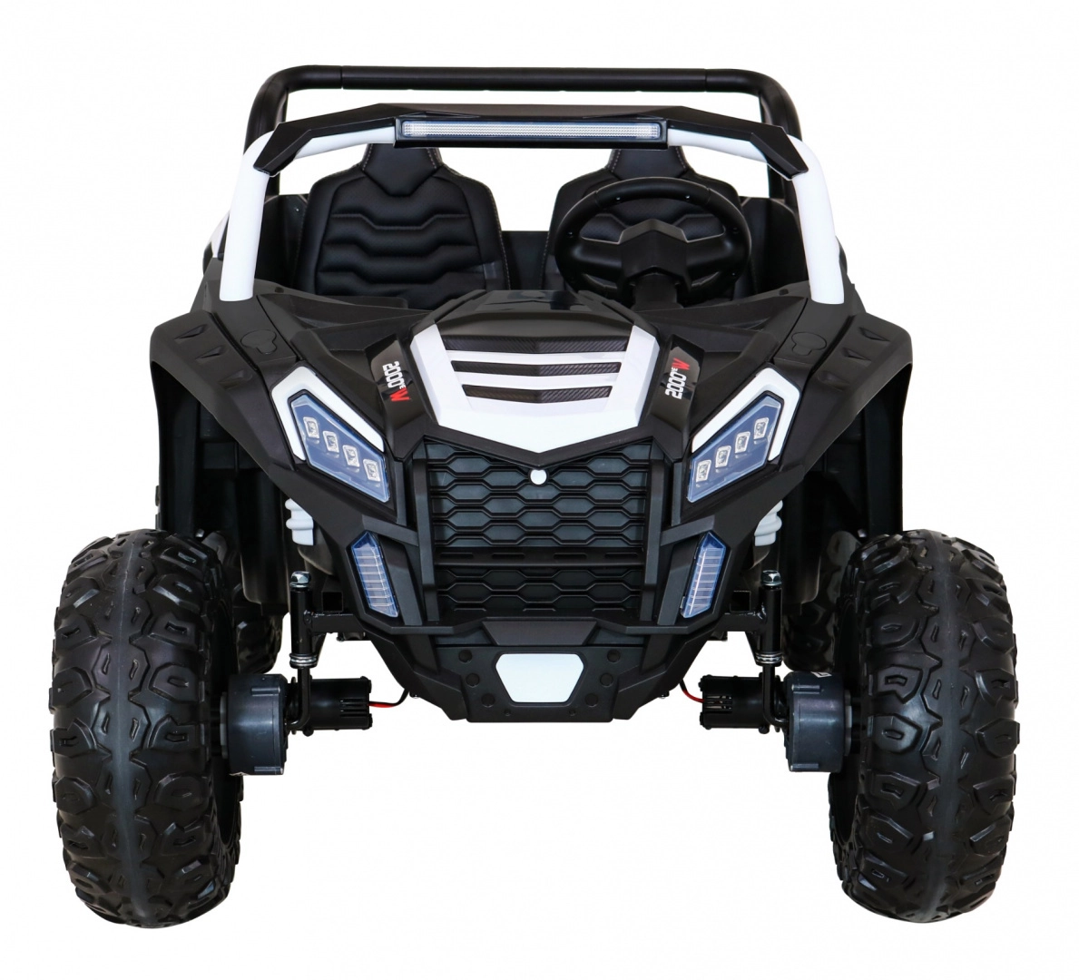 Výkonné detské elektrické buggy pre dve deti prináša pohon 4x4, batériu 24V 7Ah a štyri motory 4×200 W pre plynulú jazdu aj v teréne. O bezpečie sa stará diaľkový ovládač 2,4 GHz s funkciou Stop a pomalý rozjazd. Komfort zaisťuje široké kožené sedadlo s pásmi, penové EVA kolesá 35×15 cm a LED svetlá vpredu aj vzadu. Zábavu doplní audio panel s MP3/USB/AUX/Bluetooth a zvuky v volante.