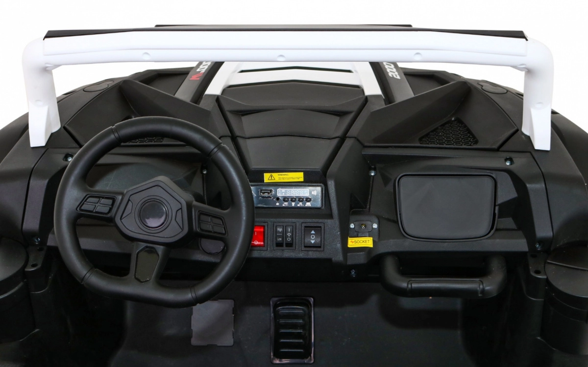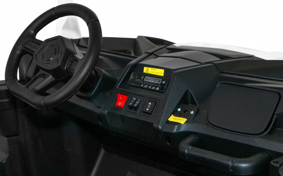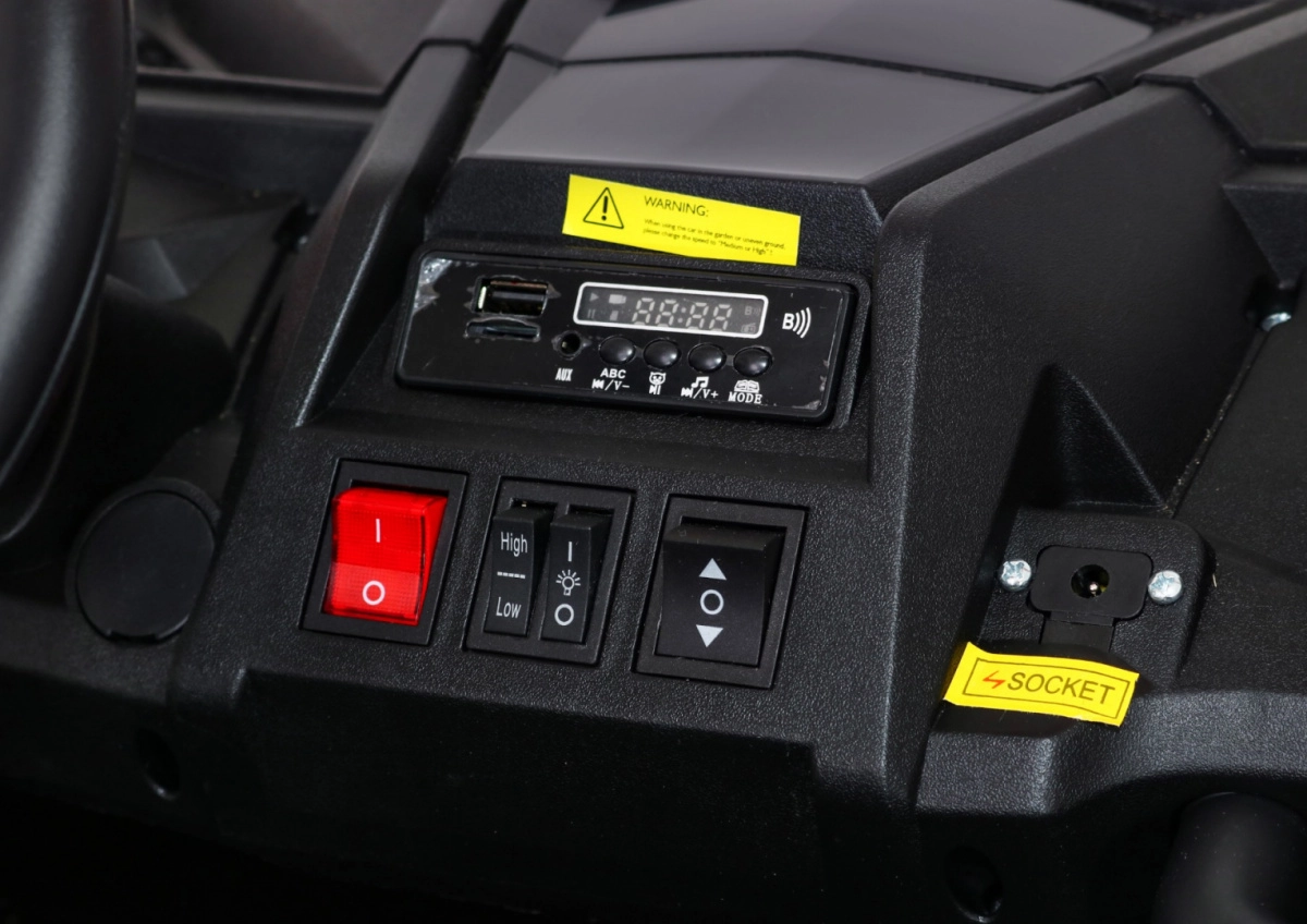 Audio panel s MP3/USB/AUX/Bluetooth a zvuky vo volante. Rodičia majú kontrolu vďaka ovládaču 2,4 GHz s funkciou Stop a voľbou 3 rýchlostí.