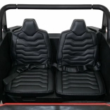 Široké sedadlo z eko kože s vetraním, bezpečnostné pásy a diaľkové ovládanie 2,4 GHz s núdzovým tlačidlom Stop pre pokoj rodičov.