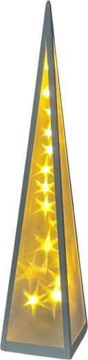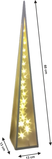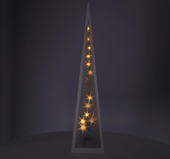 Plastová pyramída s bielym kovovým rámom vyplneným hviezdami, ktoré sa pohybujú uprostred pyramídy ✨