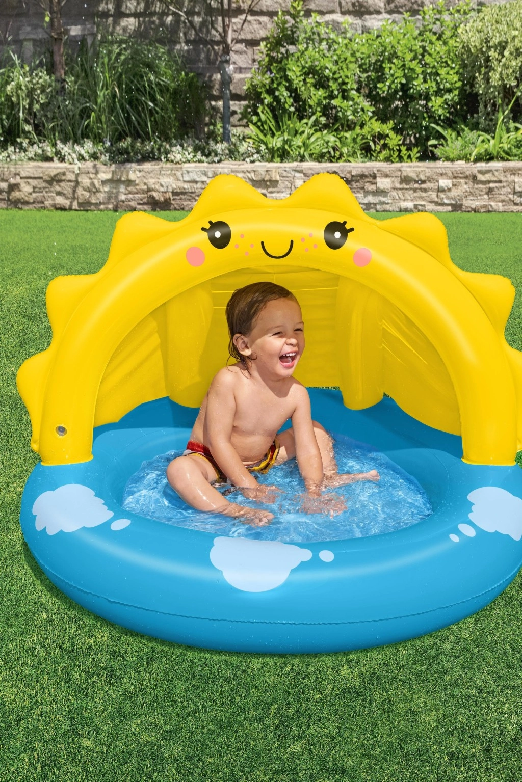Nafukovací bazénik so strieškou SLNIEČKO je skvelou voľbou pre prvé vodné hry detí. Veselý dizajn s usmiatym slniečkom a obláčikmi nadchne malých plavcov, zatiaľ čo integrovaná UV strieška poskytne príjemný tieň. Mäkké, textúrované dno zvyšuje komfort sedenia aj bezpečie pri hraní.