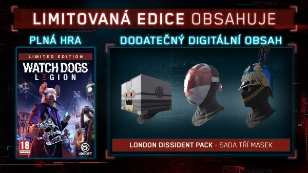 - Plná hra Watch Dogs Legion, London Dissident Pack (3 masky), bonus k predobjednávke Golden King Pack (maska, skin pištole, skin auta)