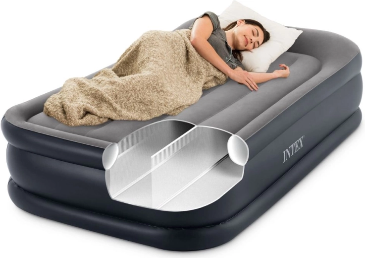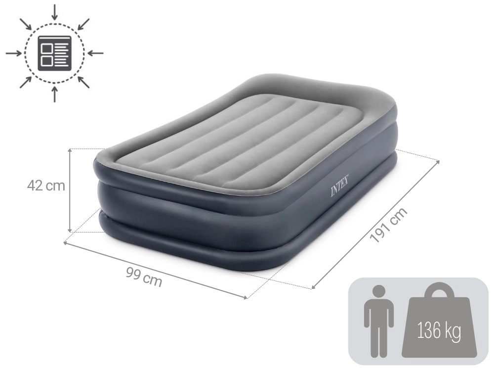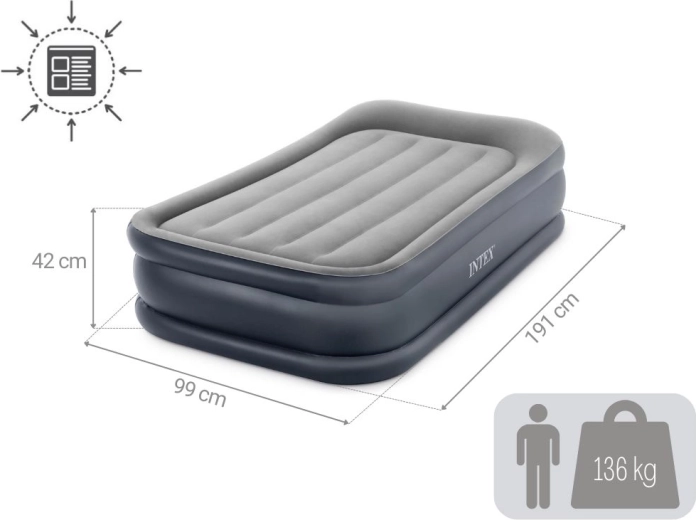 Hľadáte pohodlné a stabilné prístelky pre hostí, na chatu alebo cestovanie? INTEX jednolôžková nafukovacia posteľ s výškou 42 cm poskytuje pohodlie porovnateľné s klasickou posteľou. Velúrový povrch je príjemný na dotyk a zabraňuje kĺzaniu prestieradla, zatiaľ čo vstavaná elektrická pumpa (220–240 V) zaistí rýchlu prípravu na spánok.
