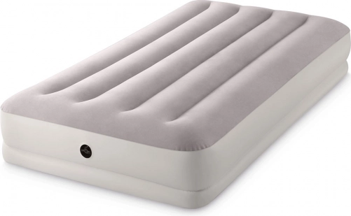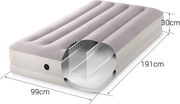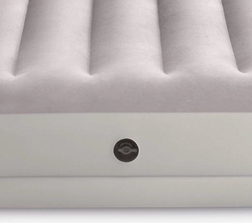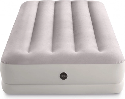 Nafukovacia posteľ INTEX kombinuje odolný PVC materiál s mäkkým flockovaným povrchom, ktorý je príjemný na dotyk a zlepšuje komfort spánku. Zvýšená konštrukcia s pozdĺžnymi komorami a vnútornými výstuhami zabezpečuje stabilitu bez hojdacieho efektu a spoľahlivú oporu chrbtice.