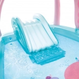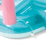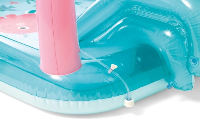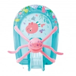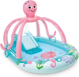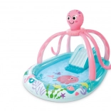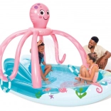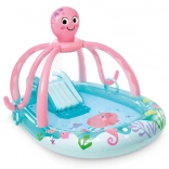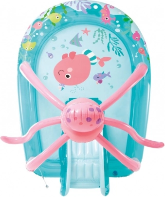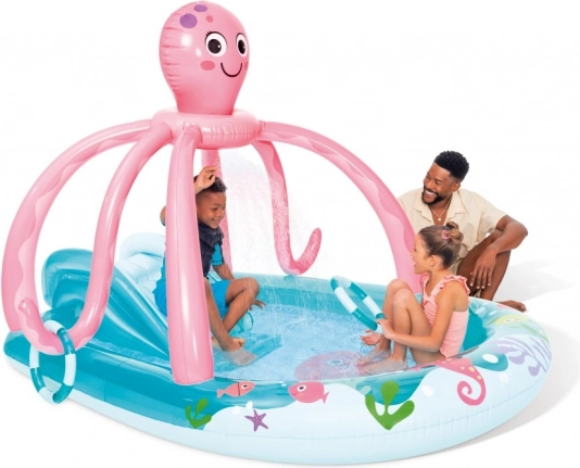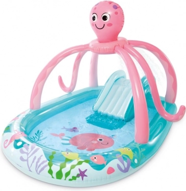 Doprajte deťom leto plné smiechu s týmto priestranným hracím centrom s motívom chobotnice. Ponúka zabudovanú vodnú sprchu na osvieženie, pohodlnú extra nafukovaciu podložku, malú šmýkačku a bohatú výzdobu s morskými motívmi. Súčasťou sú dva nafukovacie krúžky a opravná záplata. Ideálne na vonkajšiu zábavu na záhrade.