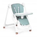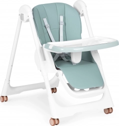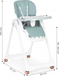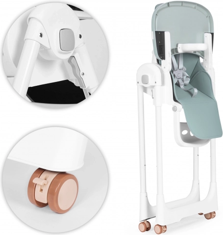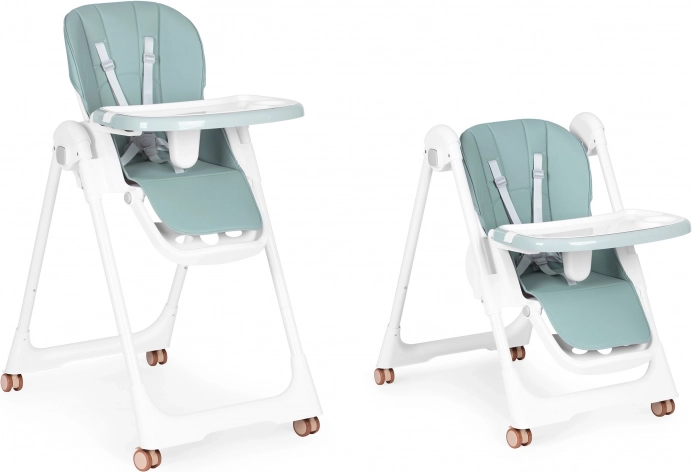 Dvojitý táck so zvýšenými okrajmi a držiakom na hrnček obmedzuje neporiadok a hornú vrstvu po jedle jednoducho zložíte a umyjete. Poťah z eko kože stačí utrieť vlhkou handričkou. Kolieska s gumovým behúňom uľahčujú presun bez poškriabania podlahy a integrované poistky kolies stoličku spoľahlivo zafixujú.