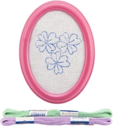 Plastový rámček s napnutým plátnom s predtlačeným obrázkom, dve ďalšie predlohy na vyšívanie, bavlnky