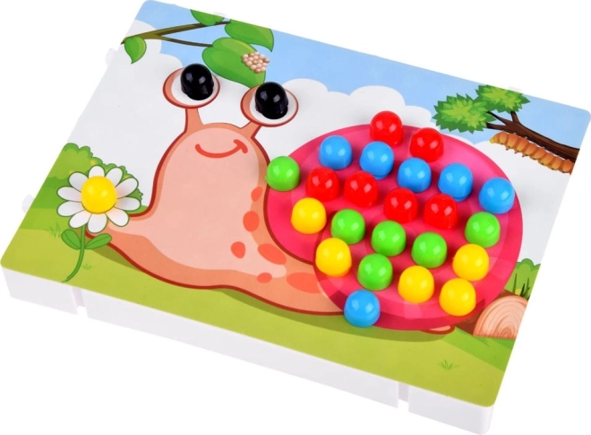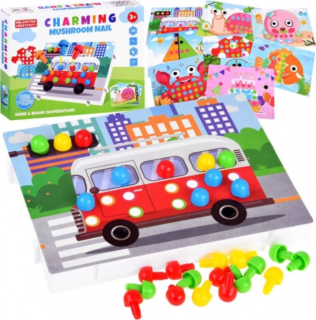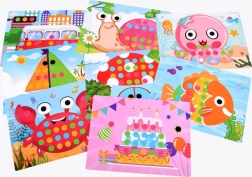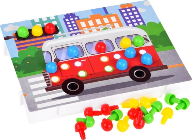 Súčasťou je bohatá sada kolíkov a rozmanité motívy (napr. rybka, autobus či slimák), takže si deti precvičia aj rozlišovanie farieb a tvarov a môžu sa púšťať do vlastných nápadov. Vďaka jednoduchému princípu je mozaika ideálna pre predškolákov aj mladšie deti.