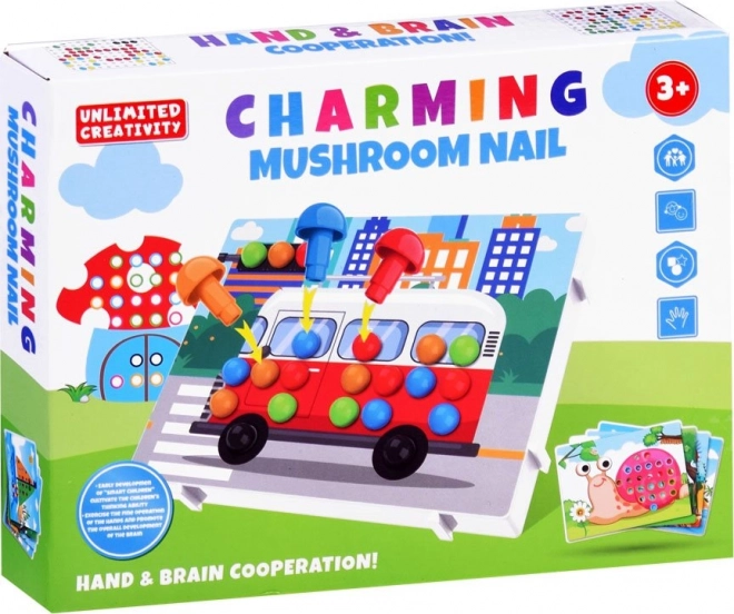 Zábavná a praktická mozaika s kolíkmi pre najmenších rozvíja jemnú motoriku, koordináciu oko–ruka, poznávanie farieb a tvarov aj kreativitu. Deti vkladajú farebné kolíky do otvorov podľa predlôh a tvoria krásne obrázky – jednoduchá a pútavá hra podporujúca sústredenie a trpezlivosť.