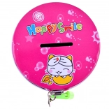 Ružový kovový povrch s veselými zvieracími motívmi a nápisom Happy Smile zaujme deti a podporí pozitívne návyky v hospodárení s peniazmi.