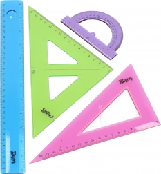 Všetky časti sady sú navrhnuté na presné rysovanie a meranie, vhodné pre matematiku, geometriu aj technické kreslenie. Farebné prevedenie podporuje rýchlu orientáciu a motivuje deti k práci s pomôckami.