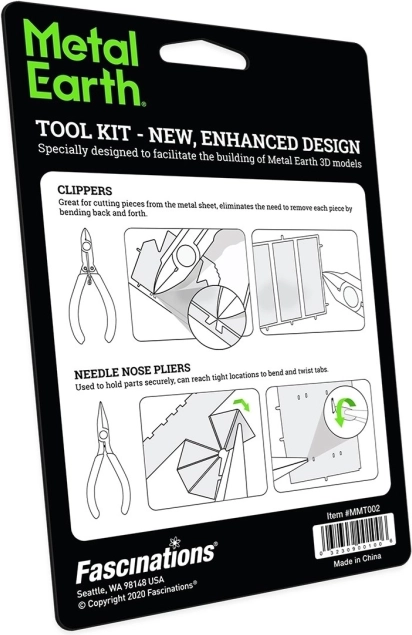Sada klieští METAL EARTH je vhodným doplnkom nielen pri skladaní 3D puzzle METAL EARTH. Balenie obsahuje: - štípacie kliešte, - ihlové kliešte Užitočných pomocníkov využijete pri skladaní 3D oceľových puzzle modelov METAL EARTH, pri vystrihovaní dielikov z kovových plátov a pri ohýbaní malých zobáčikov, ktorými sú k sebe jednotlivé dieliky pripojené.