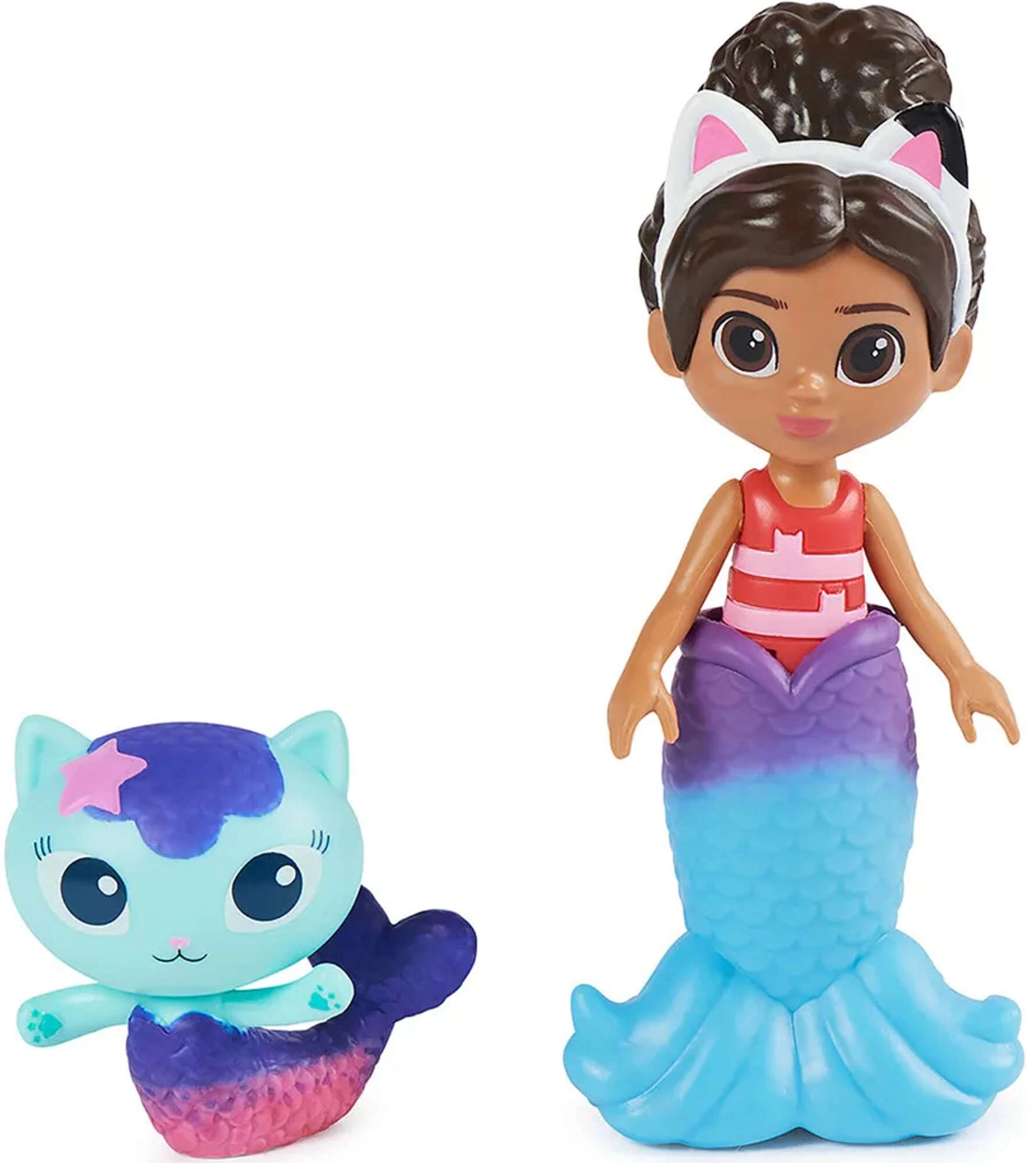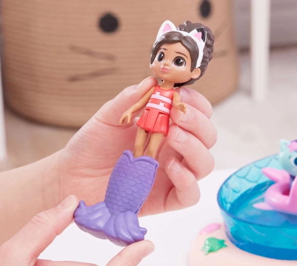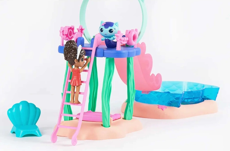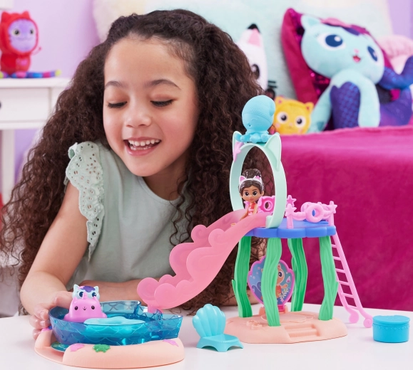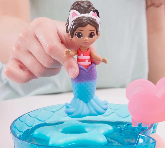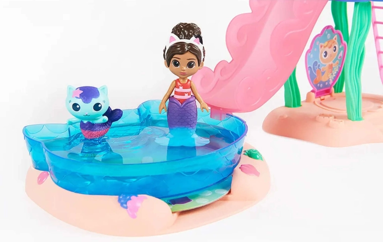 Vstúpte do sveta Mačacieho domčeka s parádnym bazénikovým setom, kde sa Gábi a Syrenkočka spúšťajú po ružovej šmykľavke priamo do modrého bazénika. Pomocou rozprašovača v tvare chobotničky aktivujte magickú zmenu farieb na ich chvostových plutvách a objavte skryté prekvapenie v obrej lastúre pod šmykľavkou.