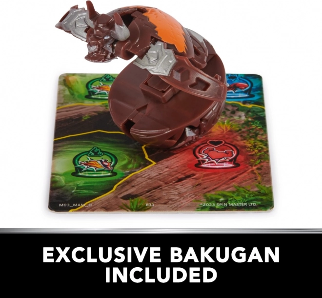 Hnedý Bakugan so striebornými detailmi sa pri prejazde po karte brány otvára do bojovej podoby – ikonická transformácia ako v seriáli.