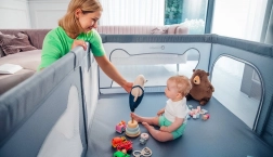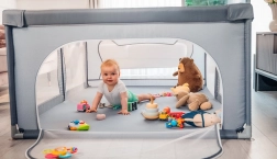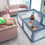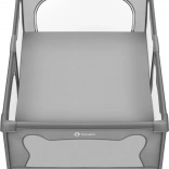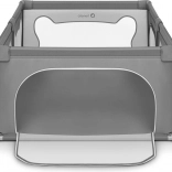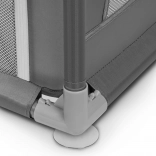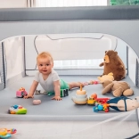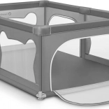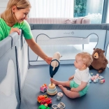 Ohrádka ponúka bezpečné miesto na hranie bez rušivých prvkov vo vnútri – všetky konštrukčné časti sú umiestnené zvonka. Mäkké sieťované bočnice umožňujú dieťaťu trénovať vstávanie, prvé krôčiky či pretáčanie s minimálnym rizikom a zároveň poskytujú skvelú viditeľnosť pre rodičov. Vyššie a pevné steny zabraňujú samovoľnému opusteniu, takže dieťa má čistý a chránený priestor na každodennú zábavu.