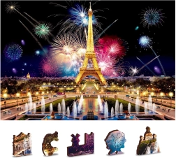 Puzzle je obojstranné (2v1): z jednej strany skladáte podľa farebného motívu nočnej Paríža s ohňostrojom, z druhej podľa opakujúceho sa vzoru len podľa tvarov dielikov. Hladké hrany bez triesok zabezpečuje precízne laserové spracovanie a pevná HDF doska s hrúbkou 3–4 mm. V balení nájdete aj samostatnú predlohu pre pohodlnejšie skladanie.