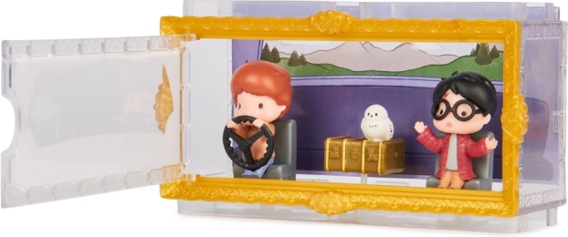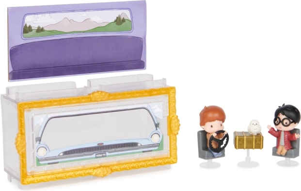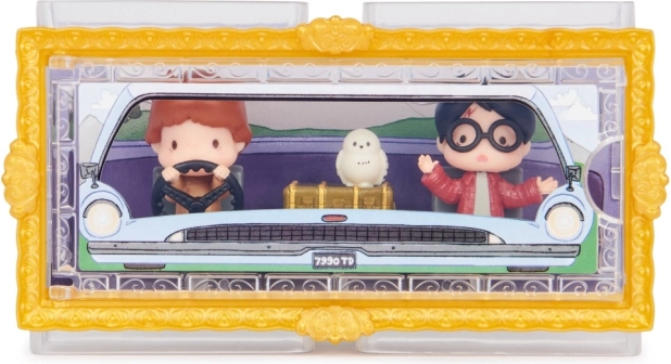 Vstúpte do sveta Tajomnej komnaty s detailne spracovanými mini figúrkami s výškou 3,81 cm. Harry a Ron v ikonickom lietajúcom aute Weasleyovcov a sova Hedviga potešia každého fanúšika. Priehľadná krabička s tematickým pozadím vytvára efekt, akoby postavy sedeli priamo v aute – perfektné na štýlové vystavenie.