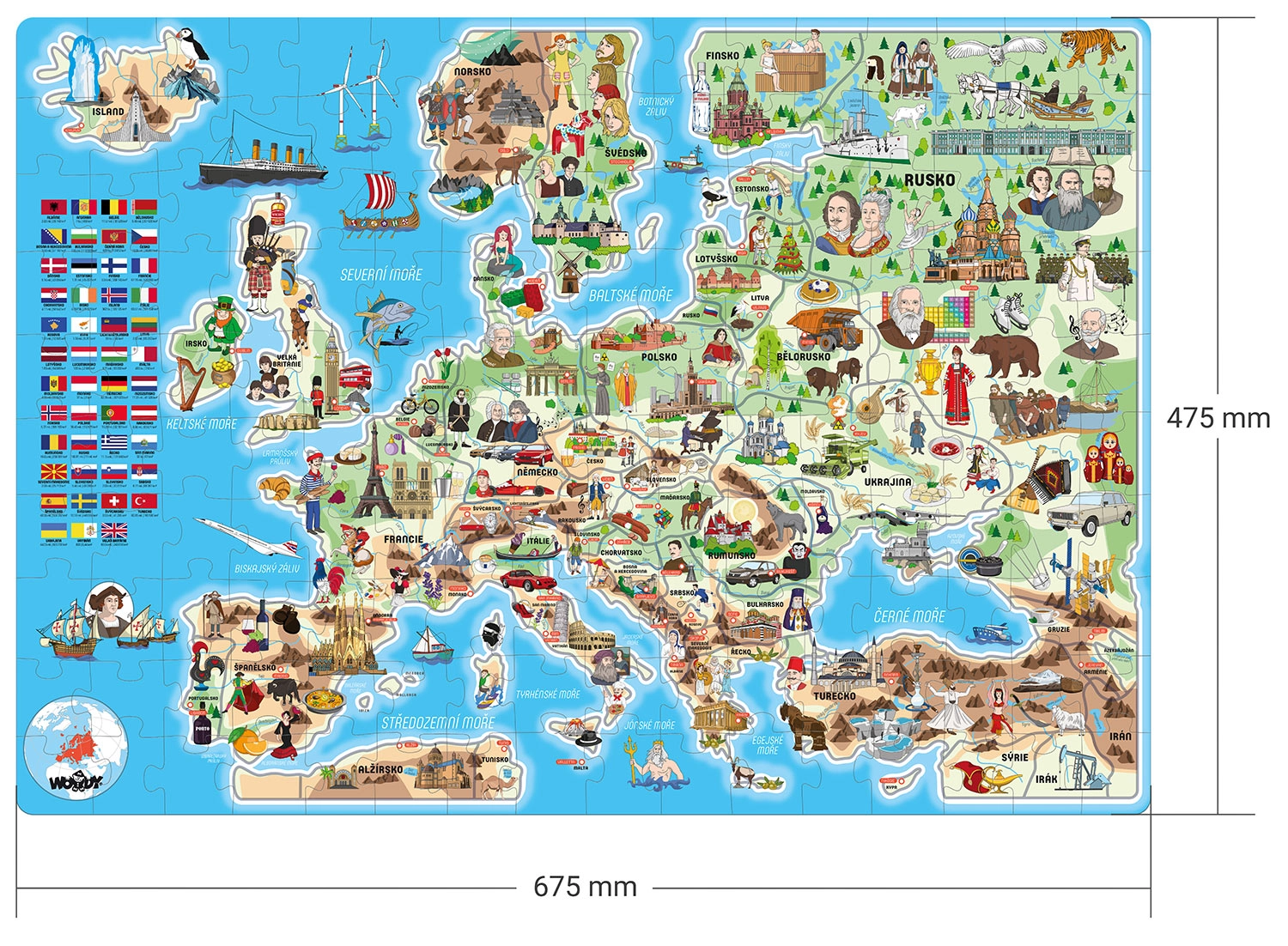 Objavujte Európu zábavnou formou s detským puzzle so 160 dielikmi. Na mape nájdete ilustrácie charakterizujúce jednotlivé štáty a ich vlajky, všetky popisy sú v češtine. Skladanie podporuje postreh, zručnosť a sústredenie a vďaka farebným obrázkom zvierat, rastlín a pamiatok rozvíja predstavivosť aj znalosti geografie.