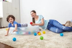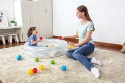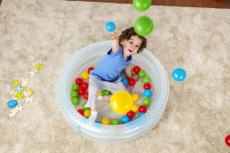 Súčasťou sady je 50 pestrofarebných loptičiek, 4 doplnkové hračky a samolepiaca záplata na rýchlu opravu. Ľahký, ľahko prenosný a rýchlo pripravený na použitie – perfektný do obývačky, detskej izby aj na záhradu.