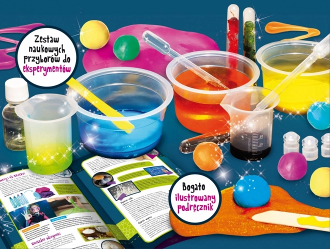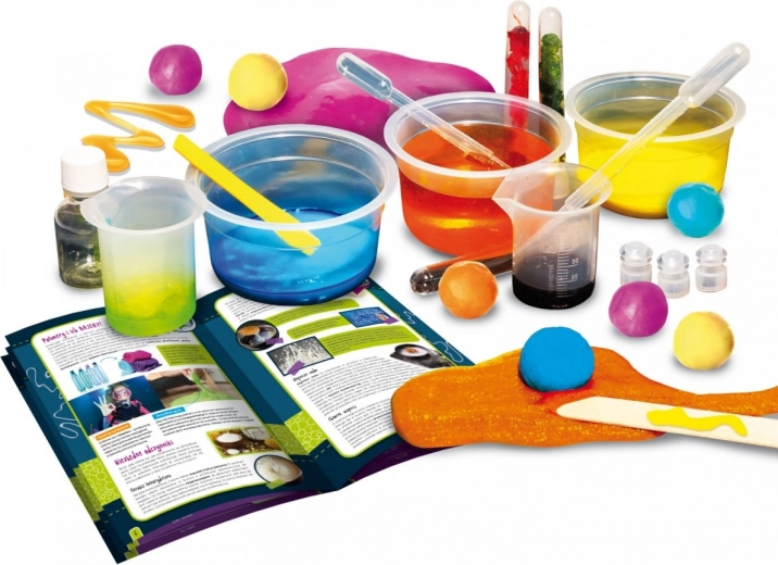 Fascinujúca a zároveň „slizká“ stavebnica, s ktorou deti vytvoria z lepkavej hmoty zábavné a kreatívne veci vrátane skákacích loptičiek, príšerkových buniek, pohyblivého piesku, ťahacieho želé alebo zábavnej plastelíny. Výrobok obsahuje bezpečné činidlá. Upozornenie: Hlíny menia farbu a skáču! Obsah: ochranné okuliare, pipeta, špachtľa, činidlá, farbivá, odmerky, fľaša, skúmavky.