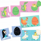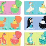 Veselé duo puzzle „Funny eggs“ spája zvieratká s ich vajíčkami či mláďatami do jednoduchých dvojíc. Deti si hravou formou precvičia rozpoznávanie tvarov a obrázkov, vizuálnu pamäť aj koordináciu oko–ruka. Vďaka veľkým, pevným dielikom sa skvele držia aj tým najmenším.