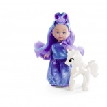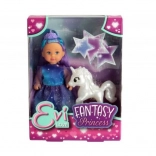 Trblietavé modro‑fialové šaty a ladiace farebné vlásky robia z bábiky Evi Love skutočnú fantasy princeznú.