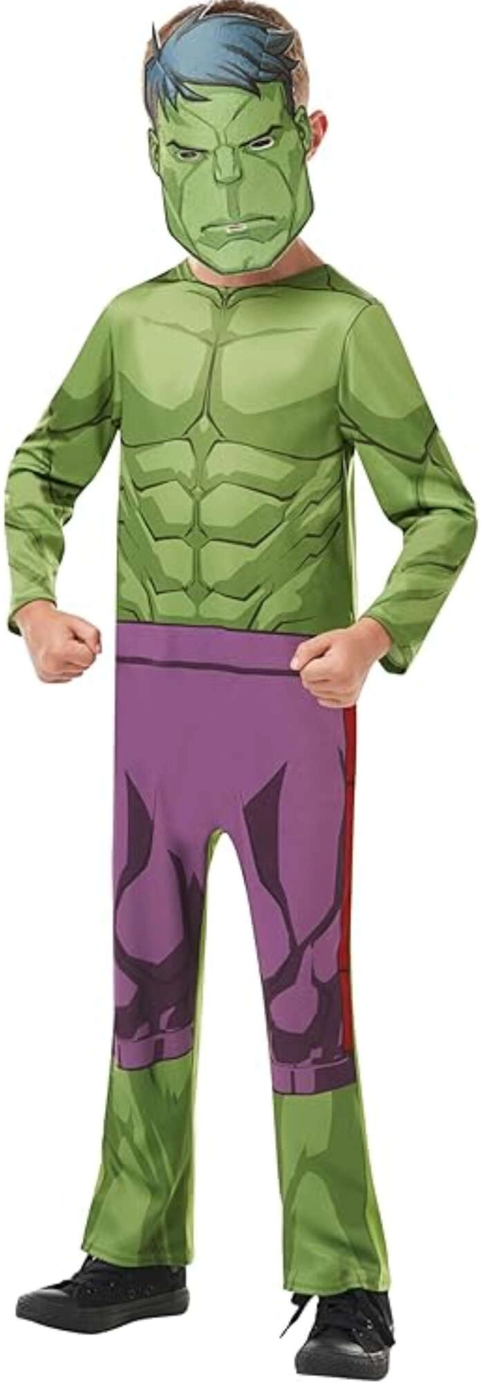 Tento detský kostým HULK verne napodobňuje vzhľad obľúbeného superhrdinu – zelené telo s výraznou muskulatúrou a typické fialové „nohavice“ sú vytlačené priamo na mäkkej látkovej kombinéze. Súčasťou je aj tvárová maska, ktorá celý look dokonale zjednotí.