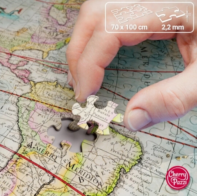 Ponorte sa do obdobia veľkých námorných expedícií a poskladajte si detailnú mapu sveta. Táto veľká sada puzzle CHERRY PAZZI s 2000 dielikmi prináša precíznu tlač a jemné detaily, ktoré potešia každého milovníka histórie aj geografie. Po poskladaní získate pôsobivý obraz s rozmerom cca 100 × 70 cm, ideálny na vystavenie.