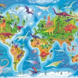Farebná ilustrácia prehistorického sveta s dinosaurami naprieč kontinentmi podporuje učenie hrou a rozvíja detskú zvedavosť.