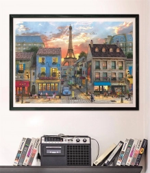 Romantická ulica s Eiffelovou vežou a večernou atmosférou vytvorí po zložení dekoratívny obraz vhodný na zarámovanie.