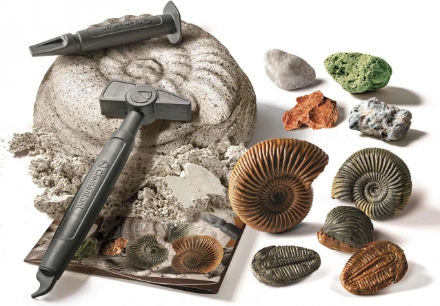 Vráťte sa v čase a staňte sa malým paleontológom. Kompaktný vykopávací blok ukrýva verné napodobeniny pravekých fosílií, ako sú amonity či trilobity, a tiež drobné minerály. Odštiepávajte sadrový „kameň“ pomocou odolného plastového kladivka a dláta a sledujte, ako sa pred vašimi očami objavujú poklady dávnych vekov.
