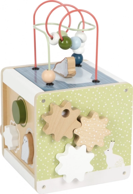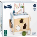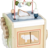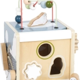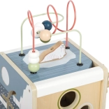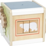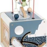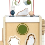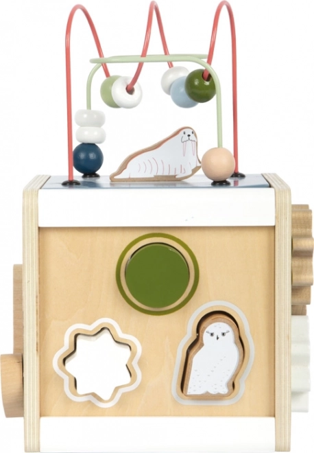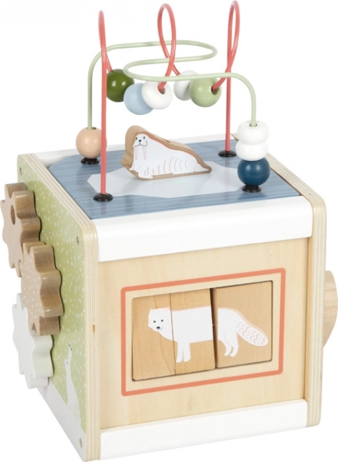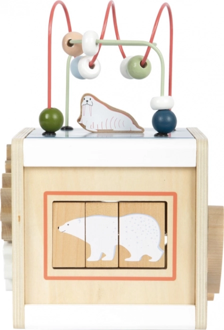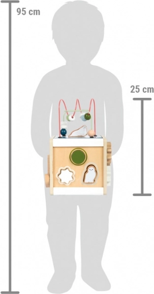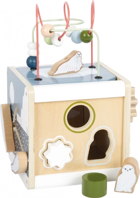Doprajte deťom nekonečnú zábavu a učenie s drevenou motorickou kockou SMALL FOOT ARCTIC zo 100 % FSC dreva. Na piatich stranách ponúka korálkové bludiská, vkladanie tvarov, posuvné labyrinty, ozubené kolieska aj otáčacie prvky, ktoré podporujú jemnú motoriku, logiku a rozpoznávanie farieb a tvarov. Odnímateľné veko uľahčí ukladanie dielikov, zaoblené hrany zaistia bezpečnú hru a moderný arktický dizajn krásne zapadne do detskej izby.
