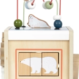Táto viacúčelová motorická kocka s motívmi arktických zvierat (ľadový medveď, tuleň, mrož a ďalšie) je premyslená edukačná hračka pre deti od 12 mesiacov. Vďaka dvom korálkovým dráham, vkladačke tvarov, posuvným bludiskám, točiacim doštičkám a ozubeným kolieskam si deti rozvíjajú koordináciu oko–ruka, trpezlivosť aj priestorové vnímanie. Odnímateľné veko umožňuje jednoduché uloženie dielikov do vnútorného priestoru.