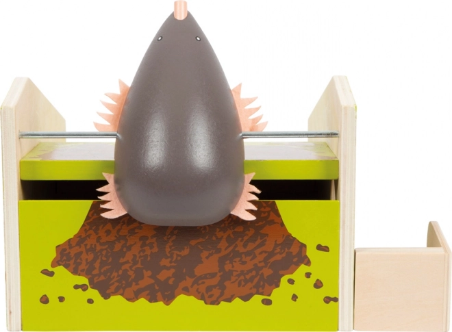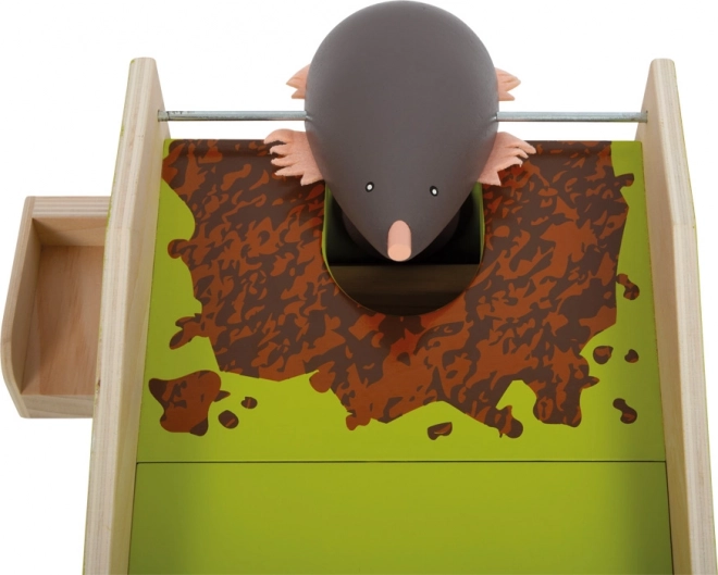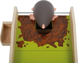 Špeciálny mechanizmus po prejdení loptičky tunelom zdvihne krtka, ktorý „zamáva“ – okamžitá spätná väzba motivuje deti hrať znova a znova.