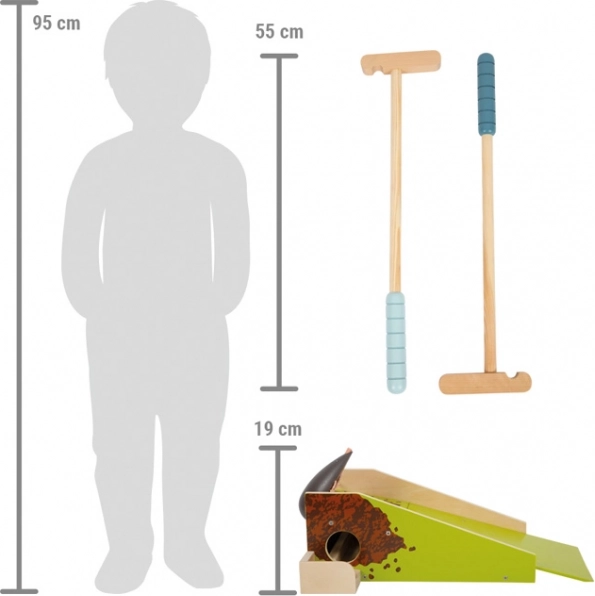 Zábavný detský minigolf z dreva s motívom krtka nadchne malých golfistov doma aj vonku. Pevná drevená dráha, dve detské palice a 2 loptičky rozvíjajú jemnú motoriku, koordináciu oko–ruka a sú-stredenie. Pri úspešnom odpale krtek vyskočí a zamáva, čo pridáva hre ďalšiu porciu motivácie a radosti.