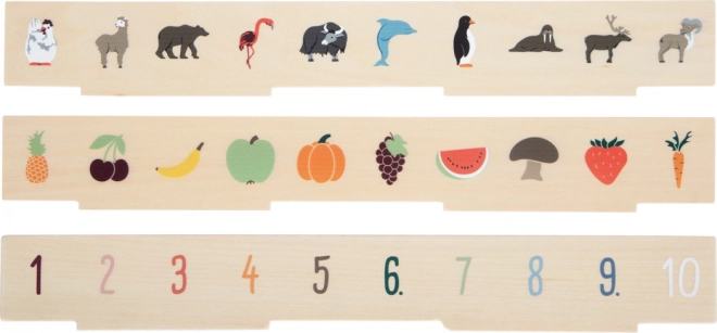Chytrá drevená hračka pre deti od 3 rokov, ktorá kombinuje triedenie, vkladanie a učenie slov. Obsahuje tri obojstranné panely a 60 obrázkových žetónov na témy doprava, zvieratá, čísla, tvary, oblečenie, ovocie a zelenina. Pri hre si deti rozvíjajú jemnú motoriku, rozpoznávanie farieb a tvarov a prirodzene si rozširujú slovnú zásobu. Bezpečné uloženie zabezpečuje drevený box s 10 priehradkami a gumičkovými západkami – ideálne aj na cesty.