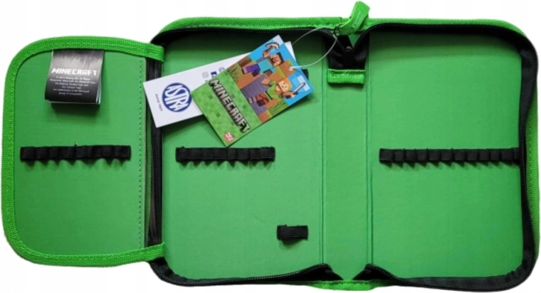 Praktický jednokomorový školský peračník s motívom Minecraft poteší všetkých mladých fanúšikov hry. Ponúka jednu prehľadnú chlopňu, gumené pútka na písacie potreby a pevný zips s veľkým tiahlom pre jednoduché otváranie. Vo vnútri nechýba priehľadná fólia na rozvrh hodín. Rozmery cca 21 × 13,5 cm. Písacie potreby nie sú súčasťou balenia.